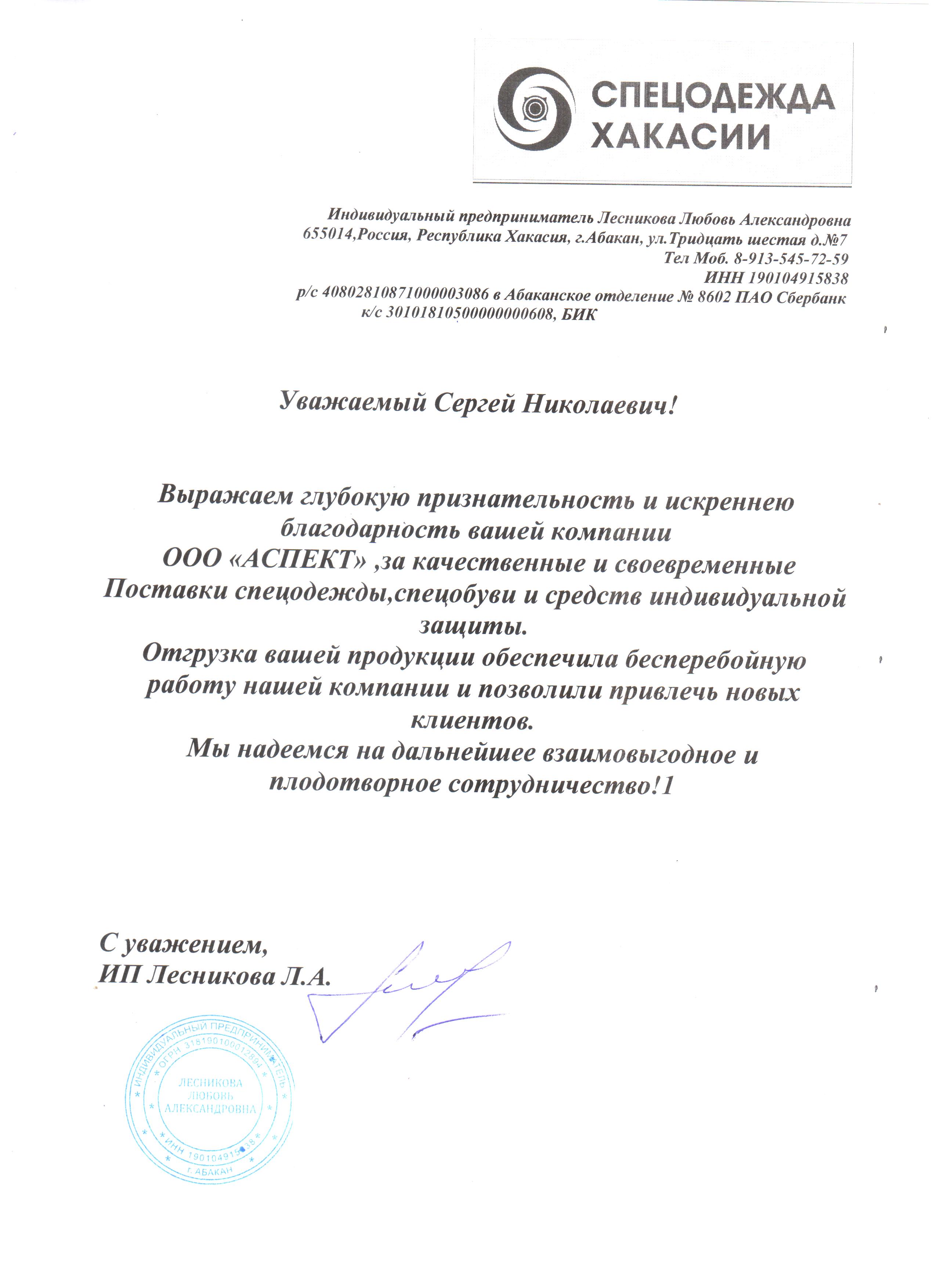 Отдельно хотели бы отметить отличный сервис, вежливость и отзывчивость Ваших сотрудников, проявленные при поставке спецодежды и средств индивидуальной защиты. Сотрудничество с Вами, позволяет нам значимо экономить рабочее время и направлять его на развитие собственной компании. Достигнутые совместно с Вами успехи помогли нашей компании добиться превосходных результатов в работе, сделать важные шаги по реализации стратегии достижения Скорости, Качества и Высокого Сервиса. Вашу компанию отличает системный подход, оперативность и эффективность в решении возникающих задач любой сложности. Верю в сохранение сложившихся деловых отношений и дальнейшее взаимовыгодное сотрудничество. Желаю Вашей компании успешного развития и достижения новых вершин в бизнесе.